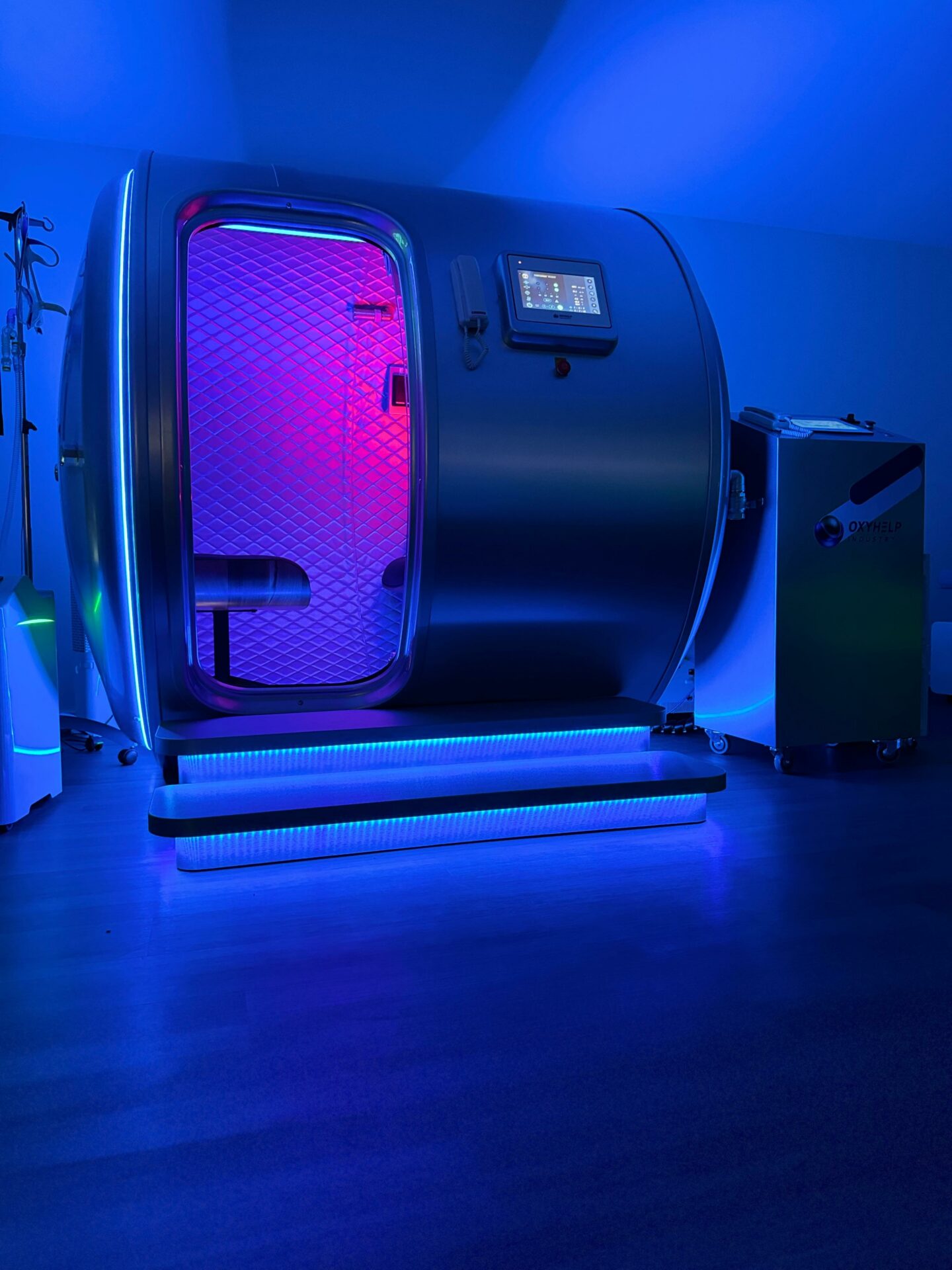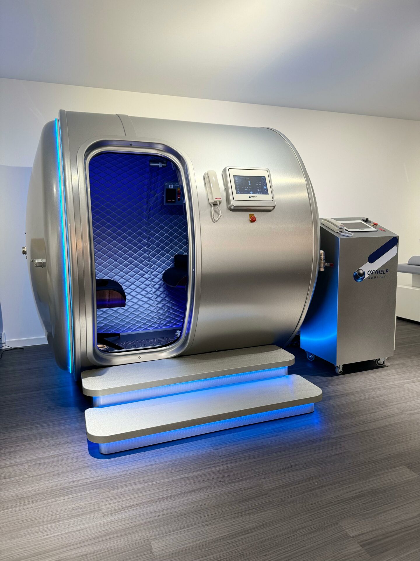 Le caisson hyperbare Oxyhelp est pressurisé avec de lʼair respirable provenant dʼun compresseur pendant le traitement. Le patient inhale de lʼoxygène de haute pureté directement via le système de respiration intégré BIBS, alimenté par des concentrateurs dʼoxygène.